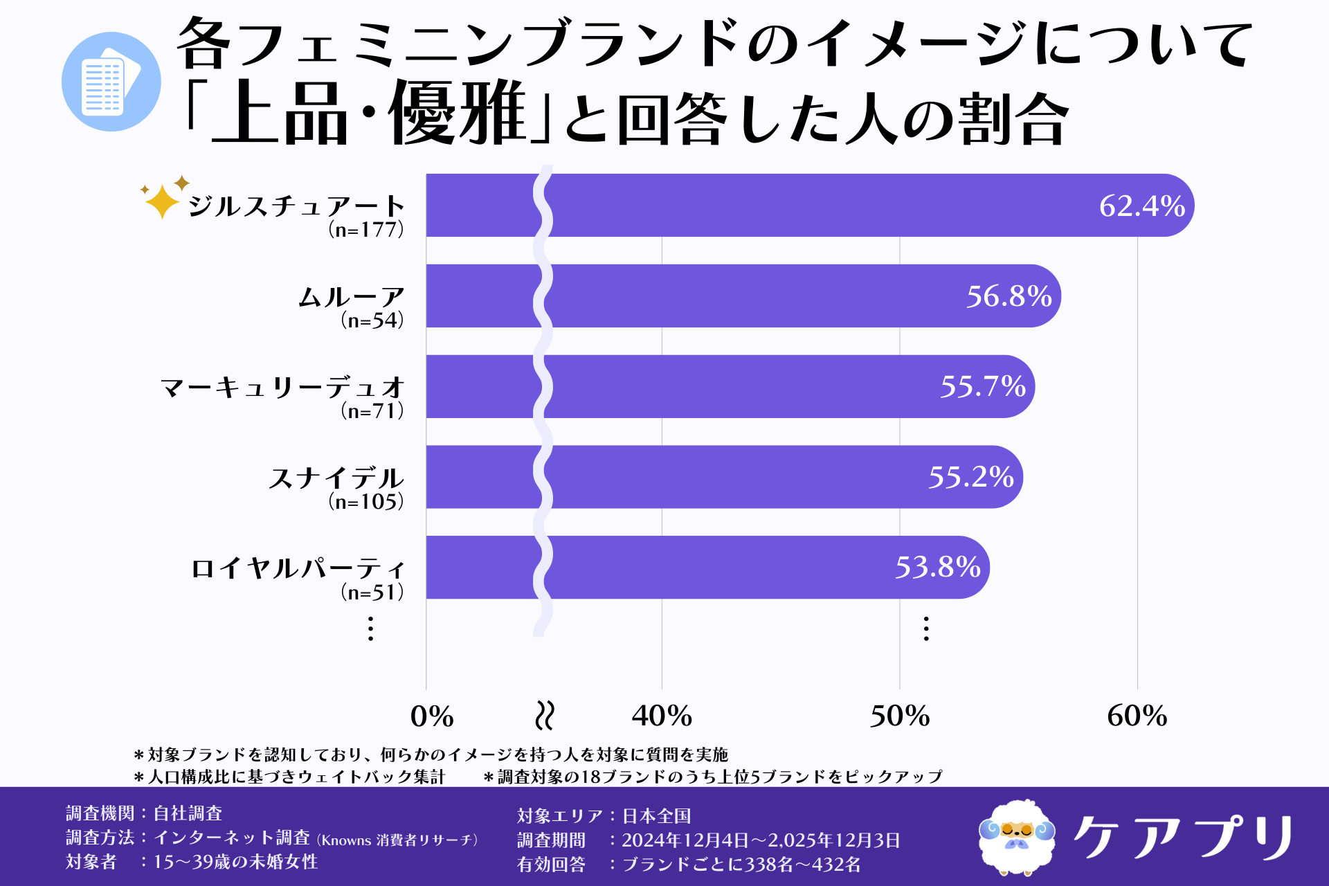 「上品・優雅」のイメージを持つ人の割合は、『ジルスチュアート』で62.4%でトップとなりました。少し差が開いて、『ムルーア』が56.8%、『マーキュリーデュオ』が55.7%、『スナイデル』が55.2%、『ロイヤルパーティ(ROYAL PARTY)』が53.8%で続くという結果です。