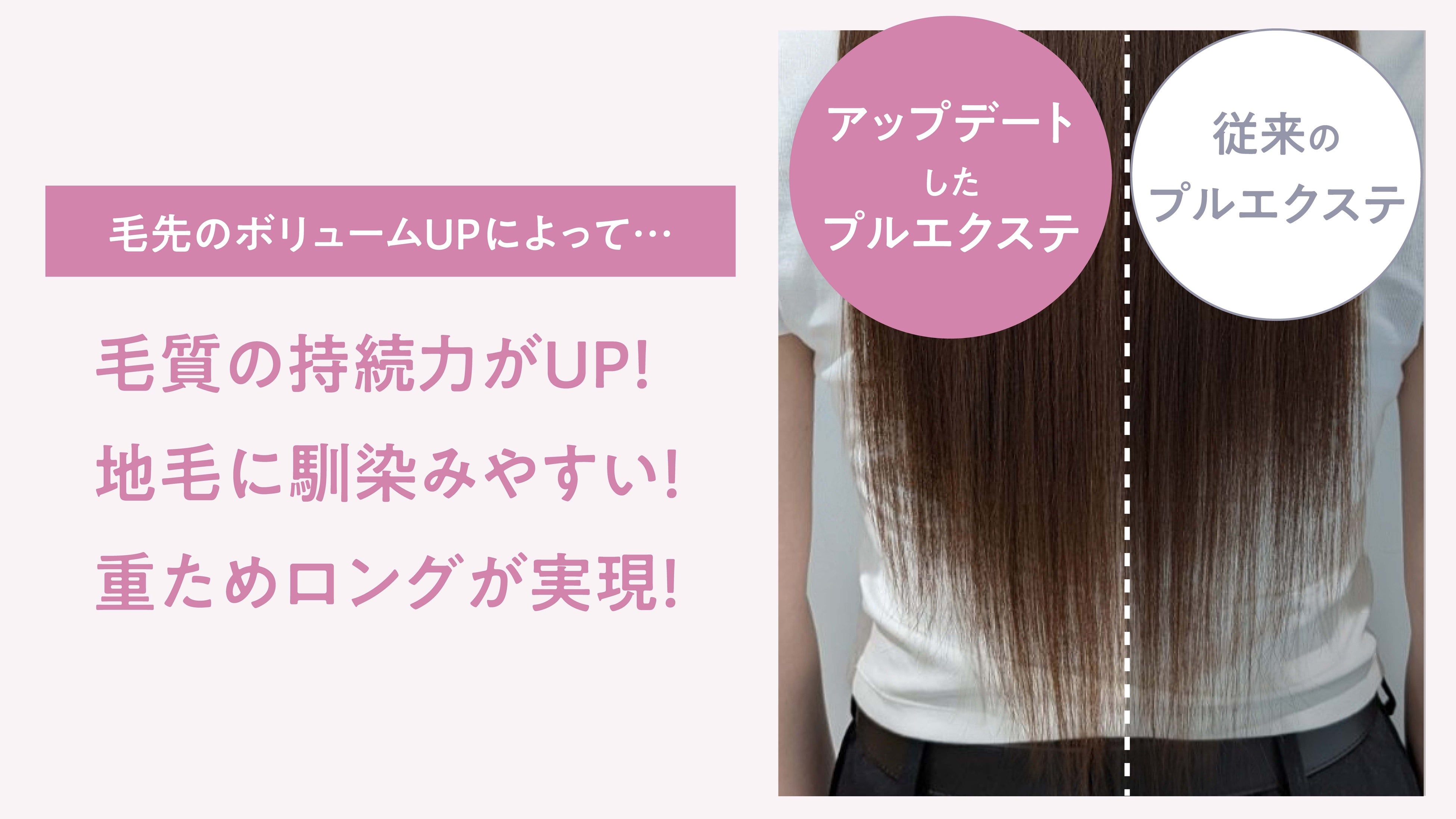 プルエクステのアップデートモデルは、従来品に比べて毛先のボリュームを強化した仕様。