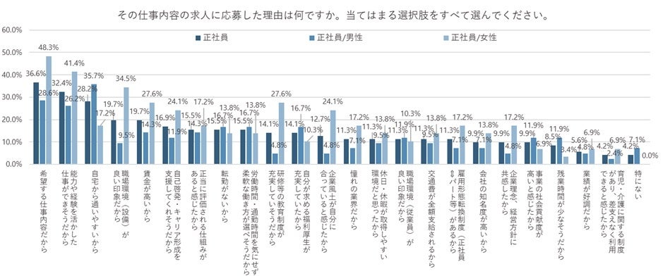 一方、「女性」のほうが「男性」よりも「職場環境(設備)が良い印象だから」が25.0pt、「研修等の教育制度が充実していそうだから」が22.8pt、「希望する仕事内容だから」が19.7pt高くなった。良好な設備環境を備えた職場で、自分のキャリアを積んでいきたい意向がうかがえる。