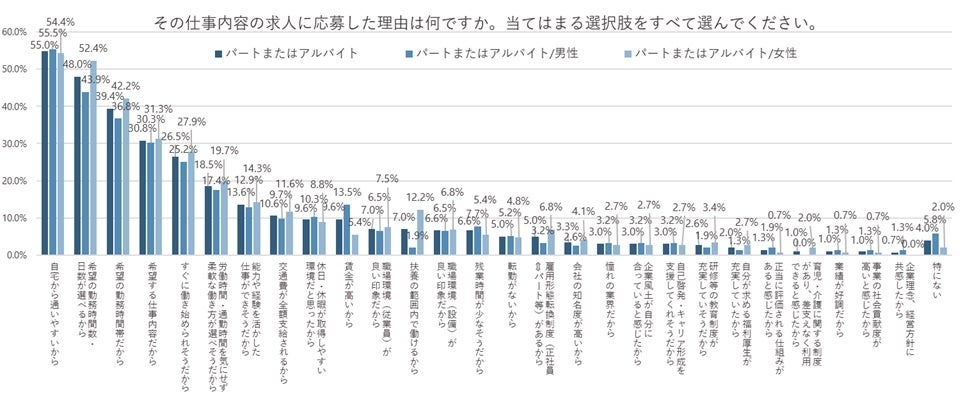 求人に応募した、パートまたはアルバイト雇用を希望する人に、自身が応募した求人を選んだ理由をきいた(複数回答)。最も多かったのは「自宅から通いやすいから」で55.0%、次いで「希望の勤務時間数・日数が選べるから」が48.0%、「希望の勤務時間帯だから」が39.4%となった。限られた時間の中で就労をしたいことから、通いやすさも同時に意識していることがわかる。