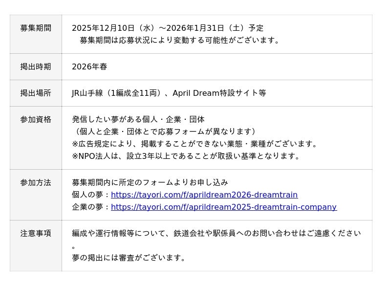 プレスリリース配信サービス「PR TIMES」等を運営する株式会社 PR TIMES(東京都港区、代表取締役:山口拓己、東証プライム・名証プレミア:3922)は、山手線の車内を夢でいっぱいにする「Dreamトレイン」の2026年春の走行に向けて、車内に掲出する夢を2025年12月10日(水)より全国から募集開始いたしました(締め切り:2026年1月31日)。