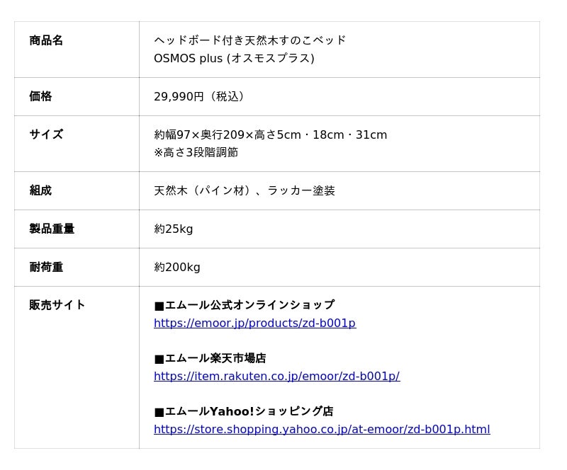 「身体に合った寝る・座る・たたむ」を提供する健康家具ブランドEMOORを展開する株式会社エムール(東京都立川市:代表取締役 高橋 幸司/以下エムール)は、2025年12月10日より『ヘッドボード付き天然木すのこベッド OSMOS plus(以下、OSMOS plus)』の予約販売(12月中旬入荷分)を開始しました。
