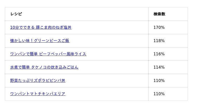 米価高騰という状況下で、このようなレシピの検索数が伸びた背景には、生活者が手に入れたお米を最大限に活かし、その特徴に合ったレシピでよりおいしく楽しむための工夫や需要が高まっている実態があると読み解くことができます。