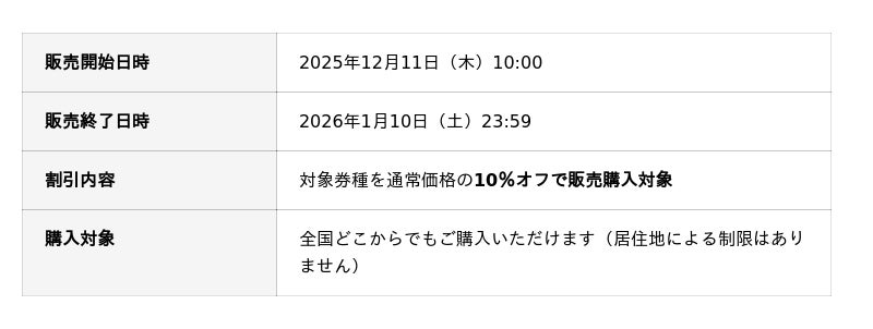 今回はお得な「10%OFFの早割チケット」も多数の券種でご用意!早割チケットは2026年1月10日(土)23:59までの期間限定、数量限定での販売となりますので、お早めにお買い求めください!