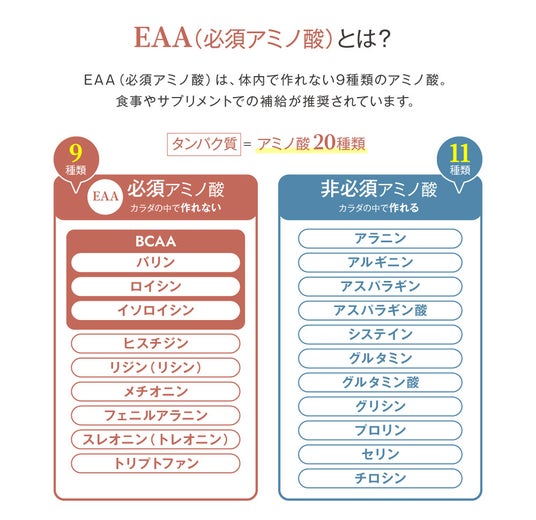 中でも体内で合成できない**必須アミノ酸9種(EAA)**は、