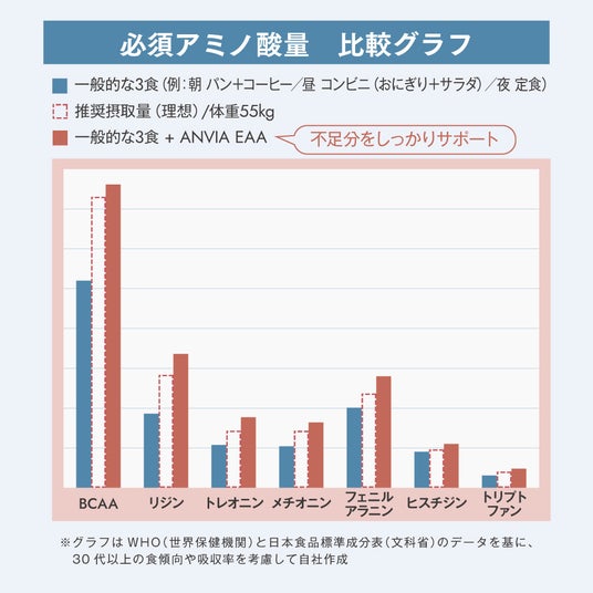 1. 食事だけでは補えない、必須アミノ酸バランス設計ANVIA PREMIUM EAAは、WHOの推奨比率データをもとに、