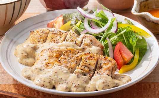 炭火でじっくり焼き上げたジューシーなチキンに、隠し味にチーズを加えたクリーミーな粒マスタードソースをたっぷりとかけました。粗挽き黒胡椒をアクセントに、チーズのコクとマスタードの辛みが絶妙に絡み合う、一度食べたらやみつきになる美味しさです。