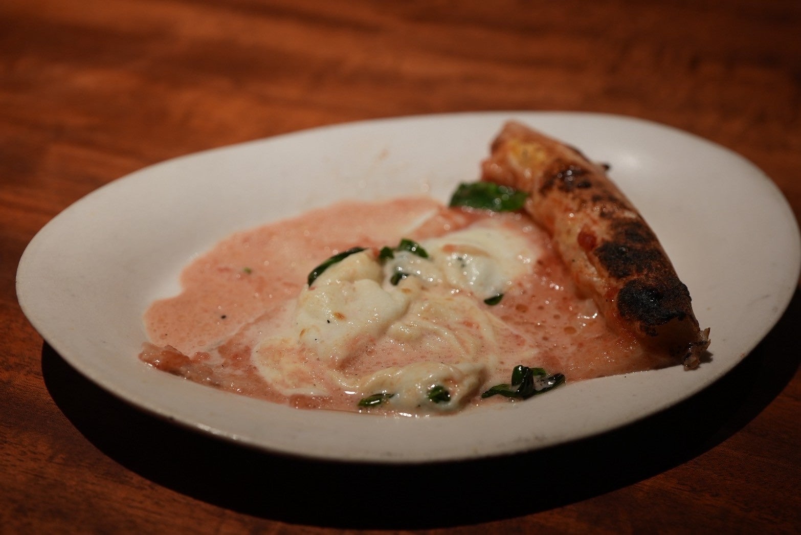 噛んだ瞬間に立ち上がる舞茸の香り、窯をくぐった生地のほのかな甘み、チーズの熱がつくる一体感。そして仕上げにまとわせた白トリュフが香りの層を一気に引き上げ、皿全体が別次元の高まりへと移行する。トルティーヤが担うはずだった役割を、ピザ生地がよりしなやかに、より立体的に受け止めることで、旨味が波のように押し寄せる。