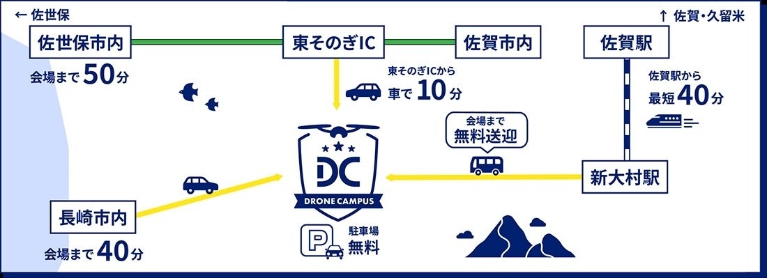 「ドローンキャンパス 長崎の空」が開校するのは、長崎県の中央部に位置し、交通の要衝でもある東彼杵町です。講習会場となる「蕪(かぶら)みどり集会施設 体育館」は、長崎市内から車で約40分、佐世保市内から約50分と、県内の主要都市からアクセスしやすい好立地です。さらに、西九州新幹線の開通により利便性が向上した「新大村駅」からは、無料送迎いたします。これにより佐賀駅方面からも最短40分ほどで最寄り駅へ到着可能となり、県境を越えた広域からの受講ニーズにも対応します 。