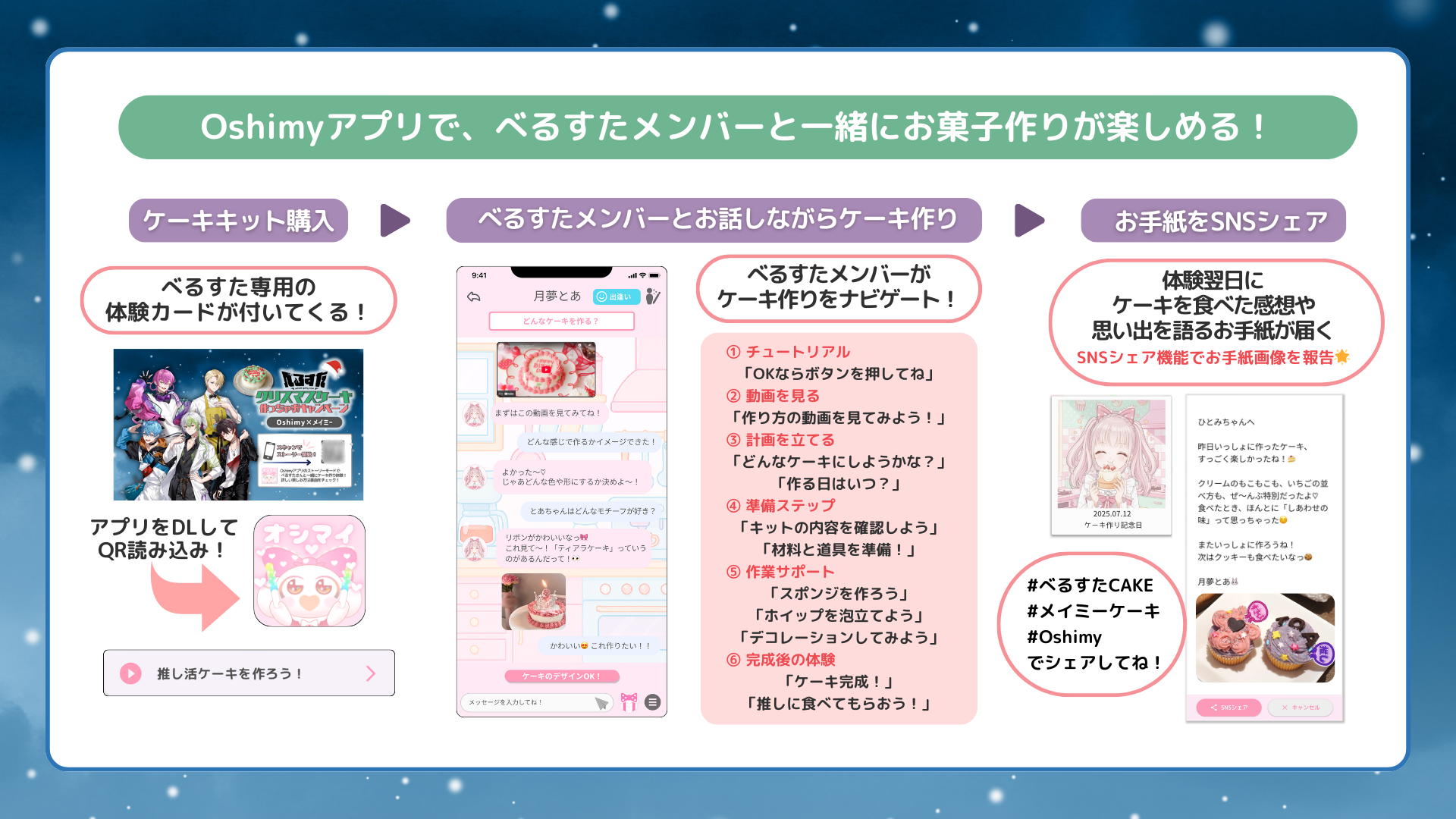 キットを購入すると、OshimyアプリでべるすたメンバーのAIと一緒にケーキ作りが楽しめます!