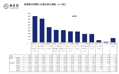 - ・終業後の時間にお酒を飲む理由は、「気分をリラックスさせたいから」(45.4%)、「一日の疲れを癒したいから」(41.0%)が2大トップ。