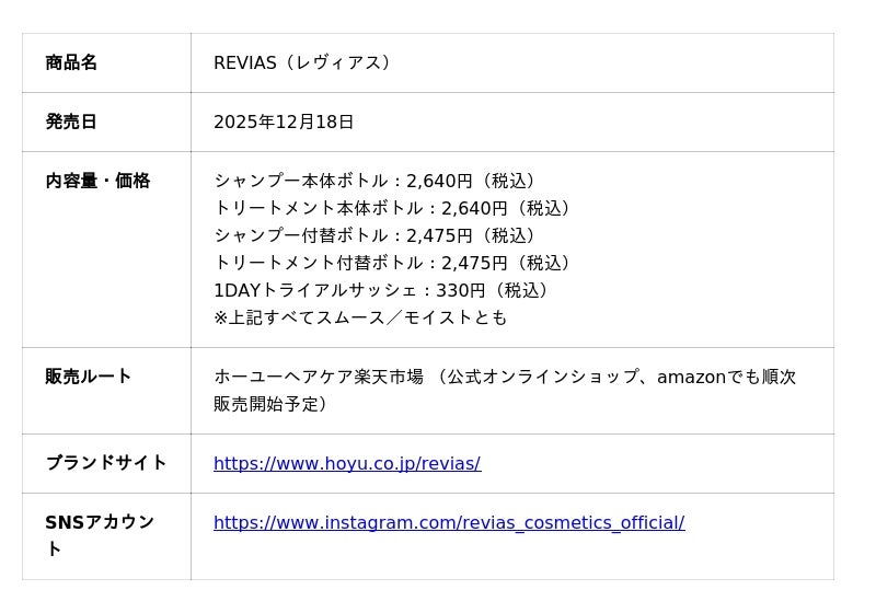 ホーユー株式会社(本社:愛知県名古屋市、代表取締役 社長執行役員:佐々木 義広、以下ホーユー)は、2025年12月18日(木)よりホーユーヘアケア楽天市場にて新ヘアケアブランド「REVIAS(レヴィアス)」を販売開始します。