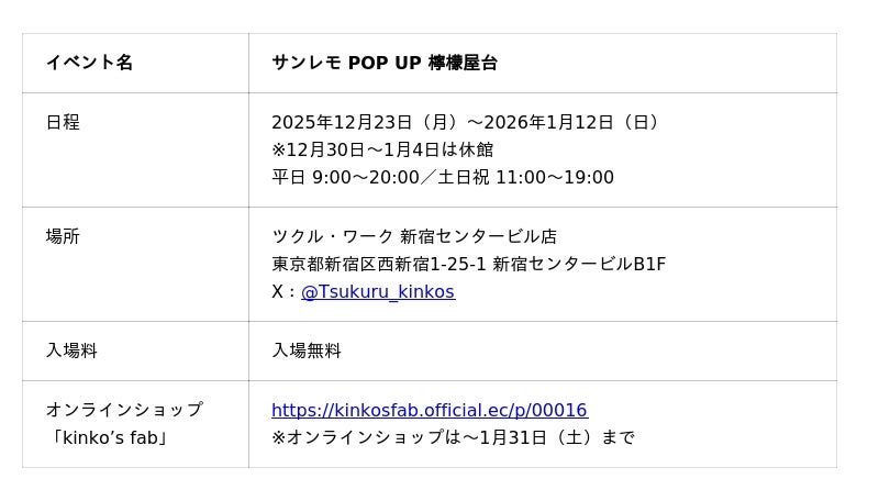 キンコーズ・ジャパン株式会社(本社:東京都港区、代表取締役社⾧:渡辺 浩基、以下 キンコーズ)は、人気イラストレーター・サンレモ(以下 サンレモ)による縁日風展示「サンレモ POP UP 檸檬屋台」を、2025年12月23日(火)~2026年1月12日(月・祝)に、ツクル・ワーク新宿センタービル店(以下、ツクル)にて開催します(12月30日~1月4日は休館)。サンレモの鮮やかな作風に、"和のモチーフ"を取り入れた作品を本展で紹介します。