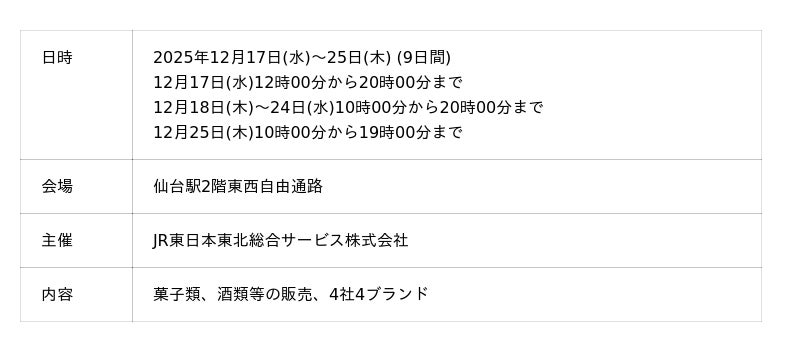 JR東日本東北総合サービス株式会社(本社:宮城県仙台市、代表取締役社長:弭間 俊則)は、JR仙台駅2階東西自由通路において、「クリスマスフェア Sweet Gift from TOHOKU」を開催します。東北各地のお店から厳選したクリスマスにぴったりの特別なスイーツやリキュールをお届けします。