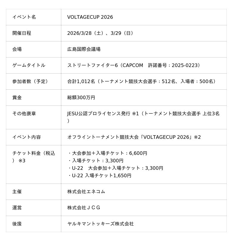 株式会社JCG(本社:東京都江東区、代表取締役CEO:松本順一、以下「当社」)は、株式会社エネコム(本社:広島県広島市、取締役社長:岡部恵二)が主催する「VOLTAGECUP 2026」において、エネコム社とともに本イベントの実行委員会を組成しました。「VOLTAGECUP 2026」は、2026年3月28日(土)・29日(日)の2日間、平和記念公園内にある広島国際会議場にて開催され、当社は本イベントの競技運営を担当いたします。