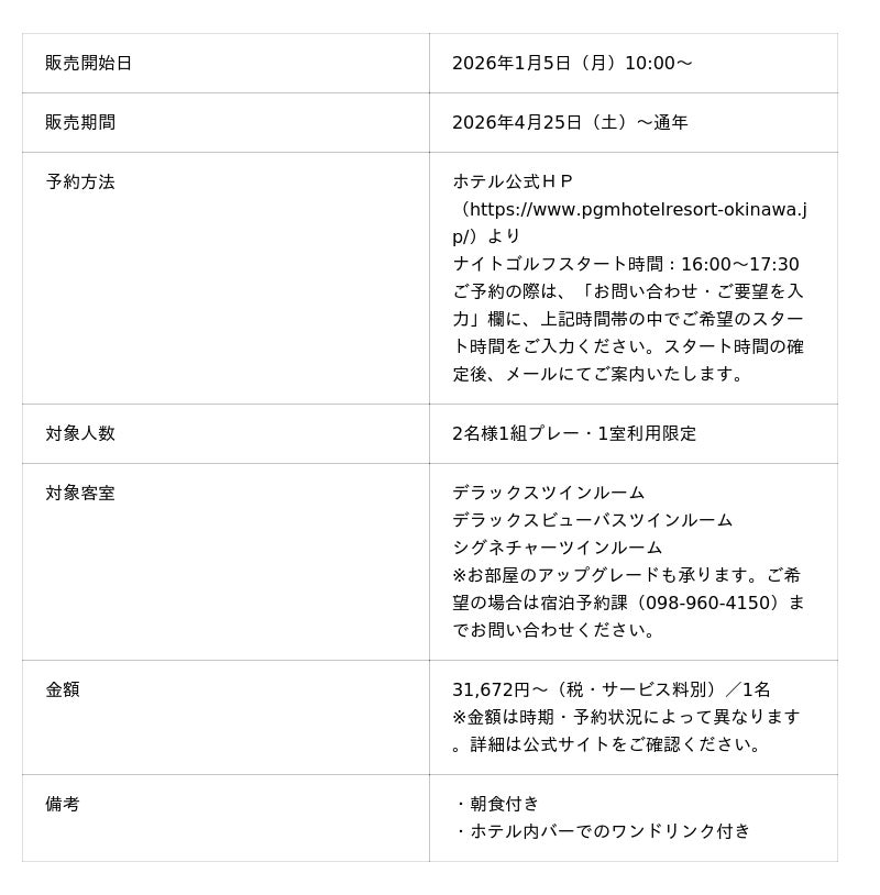 PGMホテルリゾート沖縄(運営:パシフィックゴルフマネージメント株式会社<本社:東京都台東区、代表取締役社長:田中耕太郎、以下PGM>)は、併設する「PGMゴルフリゾート沖縄」を舞台に、幻想的なナイトゴルフと上質な宿泊体験を組み合わせたプラン「ナイトゴルフステイ」を2026年1月5日(月)10:00より、ホテル公式サイトにて販売開始いたします。