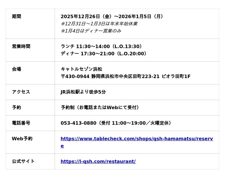 静岡県浜松市でブライダル・レストラン事業を展開する株式会社スティルアン(本社:静岡県浜松市中央区田町326-30、代表取締役社長:石川 学)が運営する「キャトルセゾン浜松」は、2025年12月26日(金)から2026年1月5日(月)までの期間限定で、年末年始特別フルコース「ニューイヤーコース」を提供いたします。