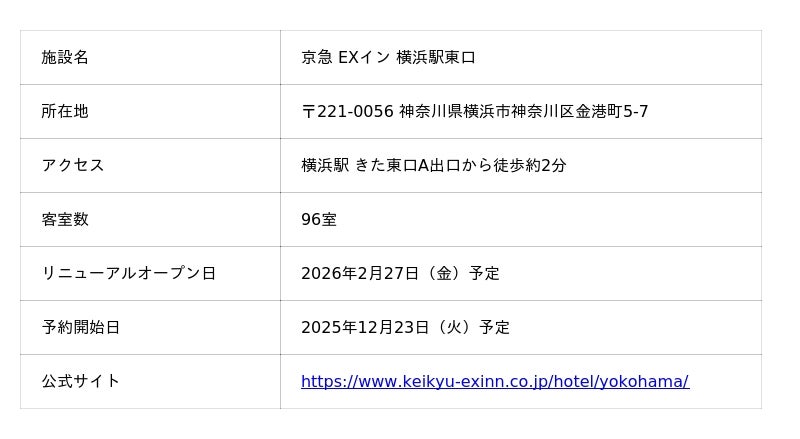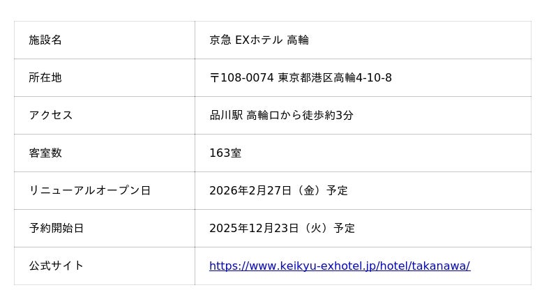 株式会社京急イーエックスイン(本社:横浜市西区、取締役社長:染崎素洋、以下 京急イーエックスイン)は、「京急 EXホテル 高輪」と「京急 EXイン 横浜駅東口」の2ホテルを、2026年2月27日(金)、同時にリニューアルオープンいたします。
