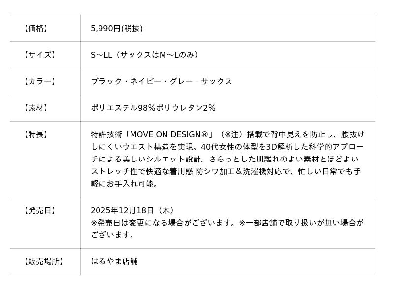 本商品は、2025年12月18日(木)より、ビジネスウェア専門店「はるやま」にて販売を開始いたします。