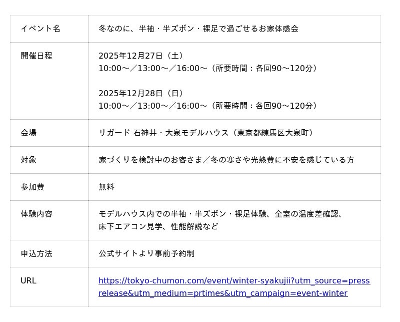 株式会社リガード(本社:東京都国分寺市、代表取締役:内藤智明)は、冬でも薄着で快適に過ごせる高性能住宅の体験イベント「冬なのに、半袖・半ズボン・裸足で過ごせるお家『体感会』」を、2025年12月27日(土)~28日(日)の2日間、石神井・大泉モデルハウス(東京都練馬区)にて開催いたします。