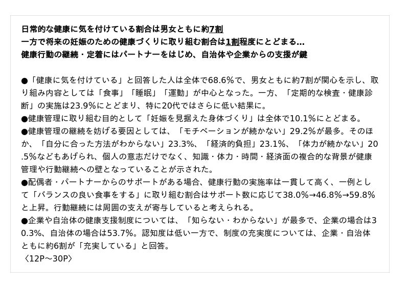 プレコンセプションケアを浸透させる上での課題や、社会として取り組むべきポイントを「日常的な健康管理行動の実態」、「妊娠・妊活への意識と実態」、「社会で支えるプレコンセプションケア」の各章ごとに明らかにしていきます。
