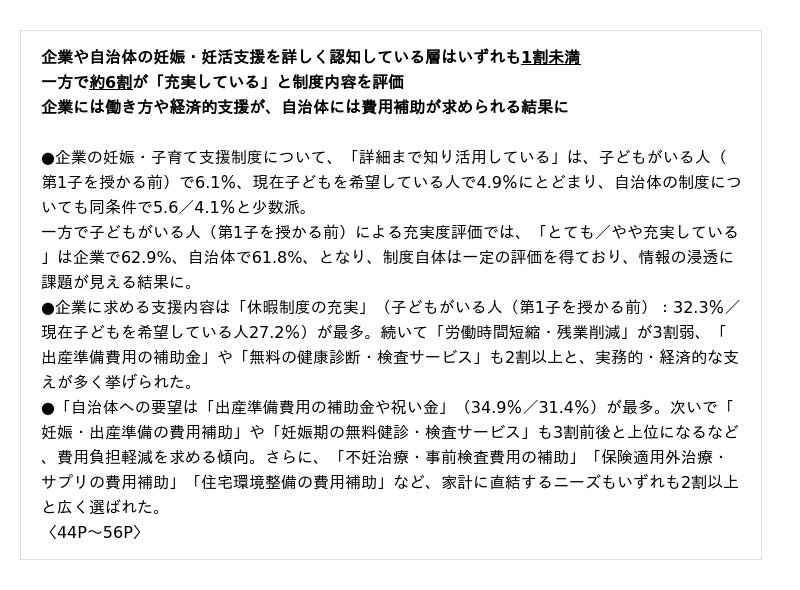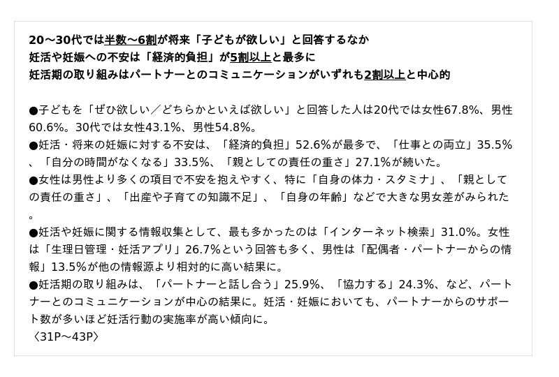 こうした結果からも、"将来の選択肢を持ち続けるための新しいライフデザイン"としてのプレコンセプションケアは、個人の努力だけではなく、身近な人・企業・自治体が連携し、行動を支える仕組みと環境の整備が不可欠であることがわかります。