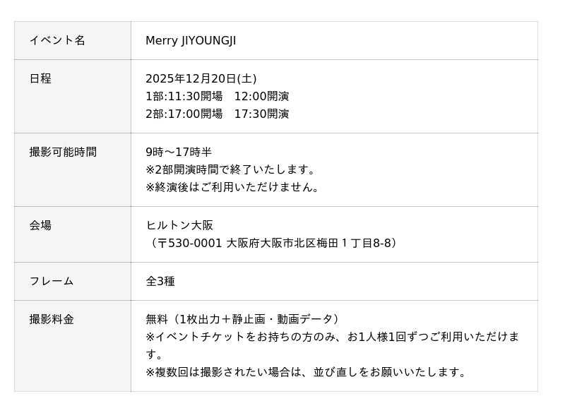 キタムラ・ホールディングス グループのピックハイブ株式会社(本社:東京都新宿区、代表取締役社長 兼 COO:大迫 由典)が運営するセルフフォトブランド「Photomatic(読み:フォトマティック)」は、2025年12月20日(土)にヒルトン大阪で開催される、KARAのジヨンとヨンジのユニット「JIYOUNGJI」によるクリスマスイベント『Merry JIYOUNGJI』に来場者限定の無料フォトブースを出展いたします。
