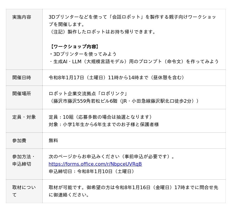 起業家創出拠点「HATSU 鎌倉」において起業支援を受け、「会話ロボット」の事業化に取り組んでいる学生起業家が、事業化に向けた実証事業として親子向けの「会話ロボット」製作体験ワークショップを、県のロボット企業交流拠点「ロボリンク」において実施することになりましたので、お知らせします。