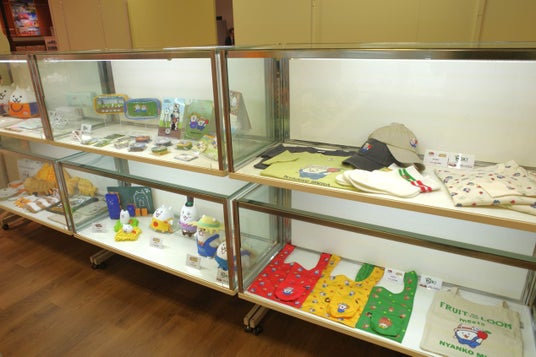 エントランスすぐの展示コーナーでは、にゃんこ大商店の公式キャラクター、「ネコ店長」と「ネコ店員」がお出迎え。周囲のディスプレイには、新商品および、今後展開予定の商品サンプルが多数展示されています。