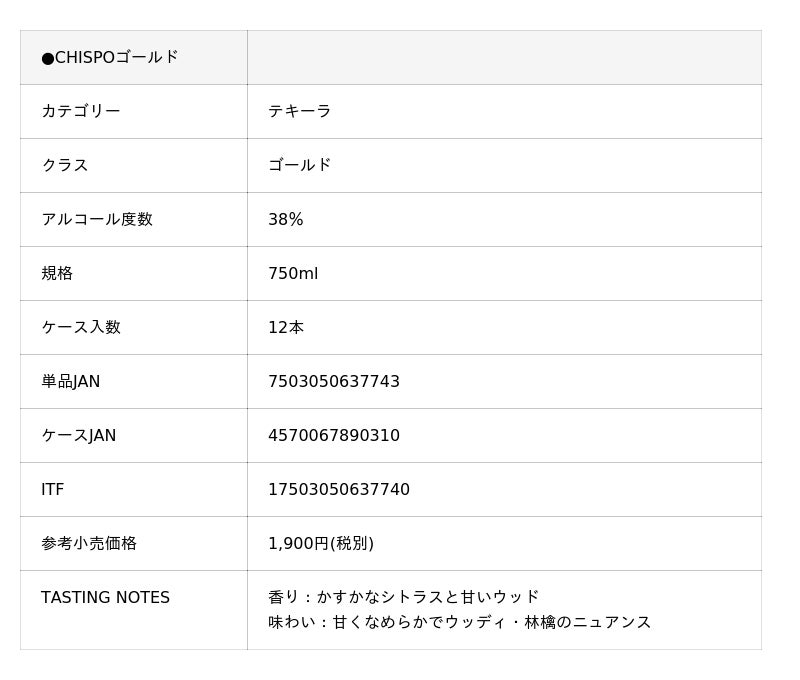 CHISPOは、ロスアルトス産アガベの特性を活かし、柑橘のようにフレッシュな風味とほのかな甘みが特徴で、飲みやすさとテキーラらしさのバランスを重視した味わいを目指しています。ストレートやロックはもちろん、ソーダ割りやカクテルなど、日常のさまざまなシーンで楽しめるテキーラです。