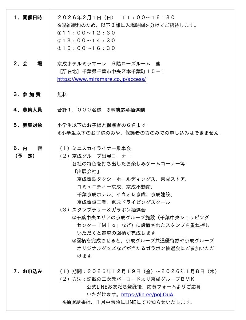 イベントは、同ホテル6階「ローズルーム」内にて開催し、お子様に大人気のミニスカイライナー乗車会や京成グループ各社それぞれの特徴を活かしたゲームブース等を展開するほか、千葉中央エリアの京成グループ施設を廻るスタンプラリーガラポン抽選会を開催します。開催にあたっては、入場時間を区切っての事前応募による3部制とし、合計1,000名様をご招待いたします。
