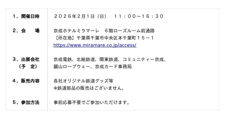 また、同日、事前応募不要でご参加いただける「京成グループグッズ販売会」を同会場前通路で行います。