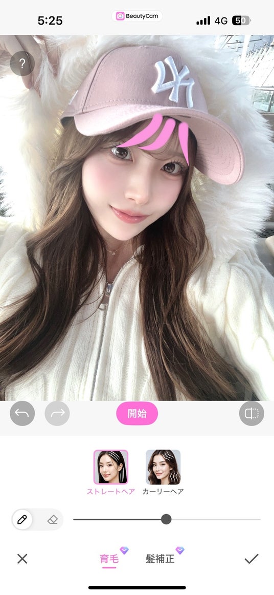 Beautycamトップ → 美顔修正 → 増毛 → 育毛 → ストレートヘア → 増やしたいところをタッチ → 開始