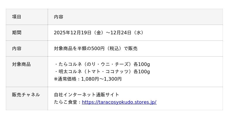 今回のクリスマスキャンペーンでは、半額の特別価格で『たらコルネ』『明太コルネ』全5種類をお試しいただけます。お子様に人気の「チーズ」、大人向けの「ウニ」、洋風の「トマト」、甘みのある「ココナッツ」など、好みに合わせて選べる豊富なラインナップでクリスマスの食卓を、彩り豊かに、楽しく演出していただければ幸いです。<キャンペーン概要>