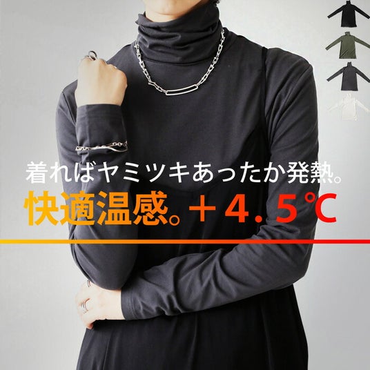 シンプルなのに、着ると違う。ヒート素材を使用したトップスは、一枚で暖かく、自然と縦ラインを強調。