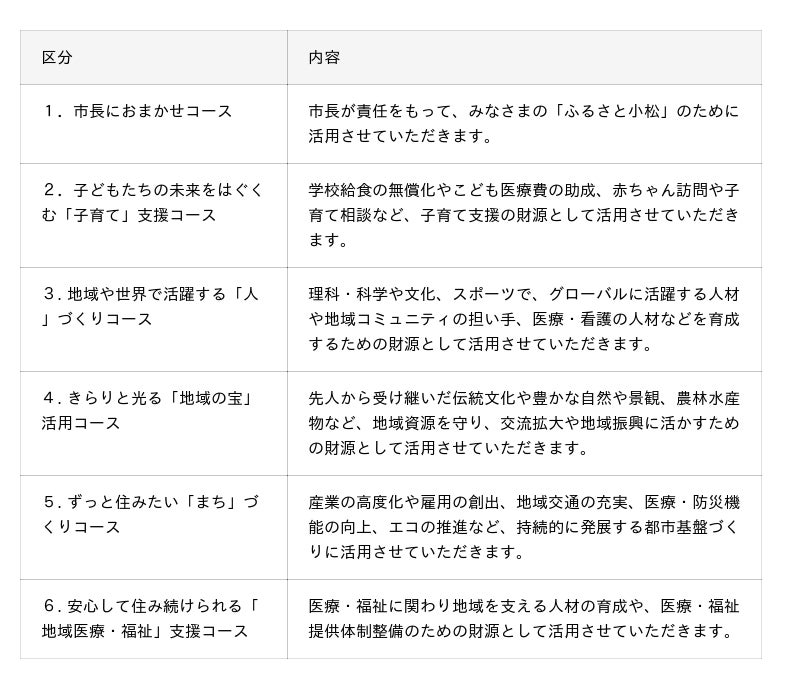 みなさまからお寄せいただいた寄附金は「小松を明るく、にぎやかに!」を合言葉に、未来志向で新しいまちづくりの実現に向けて、下記コースの各事業に活用させていただきます。ふるさとこまつ応援寄附金(ふるさと納税)