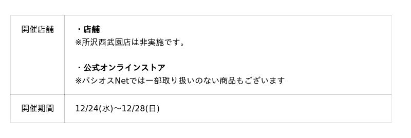 株式会社田原屋(本社所在地:神奈川県川崎市、代表取締役会長:田熊 太郎、代表取締役社長:甲斐 直裕)は、12/24(水)よりファッションプラザ[パシオス(https://www.paseos.co.jp/)]で【歳末カウントダウンSALE】を開催いたします。