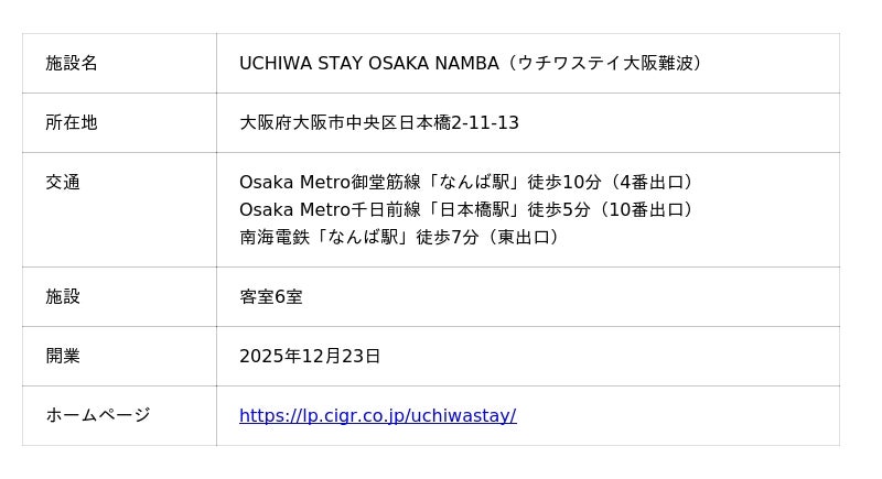 大和ハウスグループの株式会社コスモスイニシア(本社:東京都港区、社長:高智 亮大朗)は、大阪市中央区に、グループ旅行や多世代ファミリー向けの新しいアパートメントホテル「UCHIWA STAY OSAKA NAMBA(ウチワステイ大阪難波)」を2025年12月23日に開業します。本施設は、既存ビルをホテルとして再生し、約100平方メートル の広々とした客室を提供。それぞれの客室は最大8名※まで宿泊可能で、キッチンや大型ダイニングスペースなど、快適な滞在をサポートする設備を完備しています。