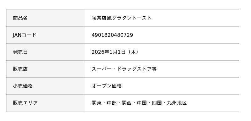 敷島製パン株式会社(Pasco)は「喫茶店風グラタントースト」を2026年1月1日(木)より関東・中部・関西・中国・四国・九州地区にて発売します。