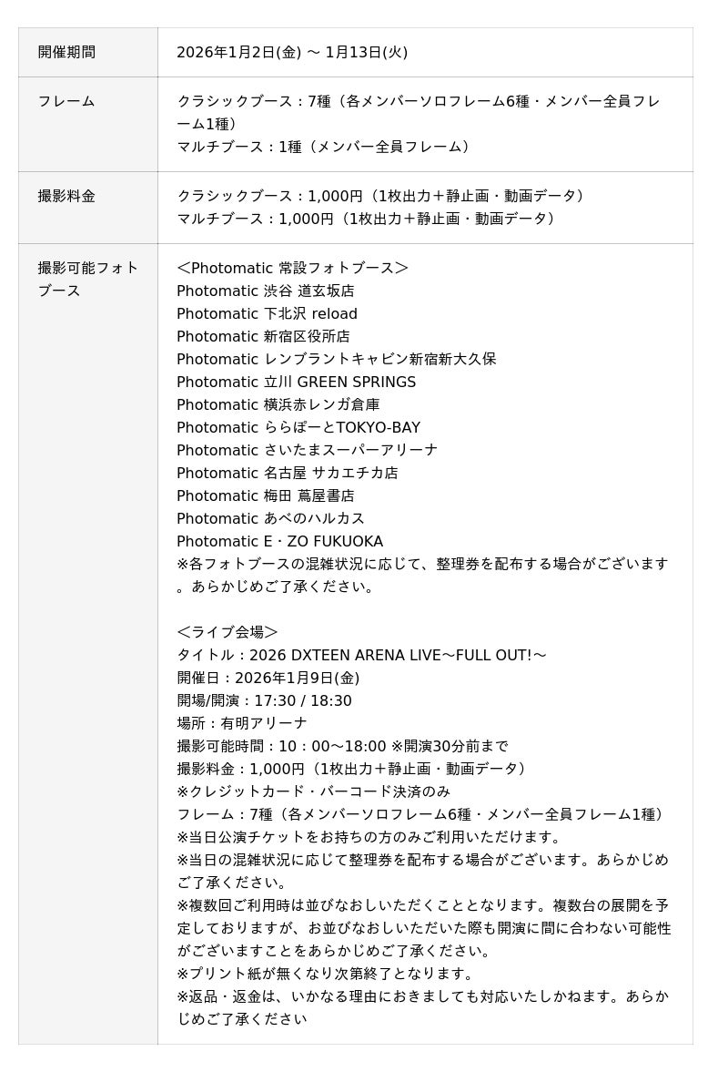 2026年1月2日(金)より全国12店舗での展開を開始し、1月9日(金)には有明アリーナで開催される「2026 DXTEEN ARENA LIVE~FULL OUT!~」にて1日限定でフォトブースを設置いたします。DETEENのメンバーそれぞれと2ショット風の撮影ができる「2ショットフレーム」をはじめ、全7種のコラボレーションフレームで撮影いただけます。