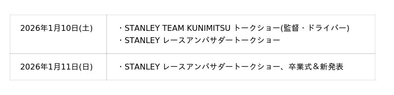 ブース内では、STANLEY TEAM KUNIMITSU(小島一浩監督、山本尚貴選手、牧野任祐選手)とSTANLEY レースアンバサダーによるトークショーを実施予定です。なお、2026シーズンの STANLEY レースアンバサダーを本会場にて発表予定です。