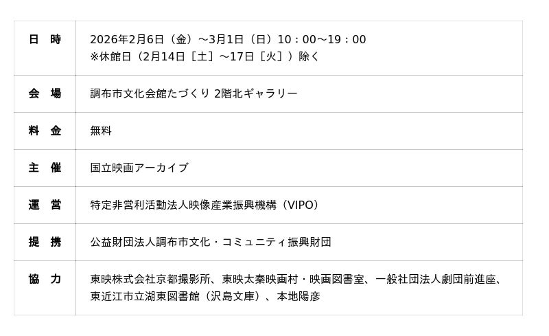 特定非営利活動法人映像産業振興機構(略称:VIPO[ヴィーポ]、理事長:松谷孝征、東京都中央区)は、国立映画アーカイブの「令和7年度アーカイブ中核拠点形成モデル事業」の一環として、「映画のまち調布 シネマフェスティバル2026」内で、映画資料の展示「天下御免!東映京都撮影所物語/劇団前進座の映画史」を開催いたします。