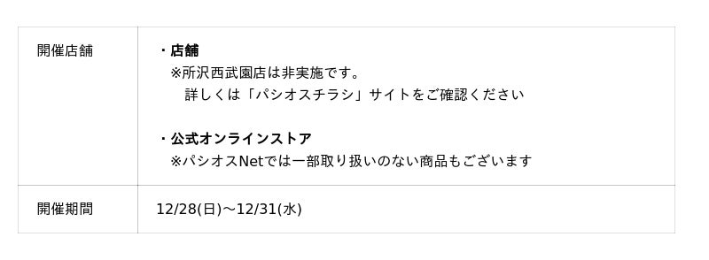 12/27(土)夕方に、チラシサイト(https://www.paseos-chirashi.jp/)にてチラシ内容を公開予定です。シークレットプライスは12/28(日)より店頭にてご確認下さい。
