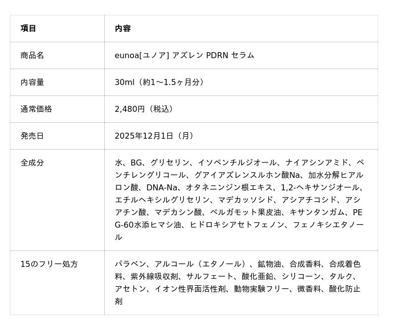 テクノロジーで美容業界の未来を創造するKalonade株式会社(本社:東京都渋谷区、代表取締役:田中 漱哉)は、肌質改善サロン(R)の知見から生まれたスキンケアブランド「eunoa(ユノア)」より、新商品「eunoa[ユノア] アズレン PDRN セラム」を2025年12月1日(月)より公式オンラインストア、Amazon、Qoo10、TikTok Shopにて発売しました。
