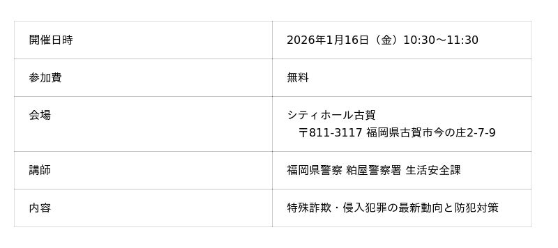 冠婚葬祭サービスを通じて地域に寄り添う株式会社ベルコは、地域住民の皆さまの安心・安全な暮らしを支援する取り組みとして、福岡県警察 粕屋警察署生活安全課による防犯セミナーを開催いたします。