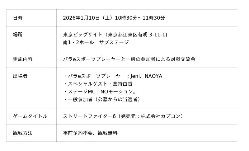 2026年1月10日(土)10時30分より、東京eスポーツフェスタ2026のステージイベント「パラeスポーツプレーヤーとのエキシビションマッチ」に、株式会社ePARA(本社:埼玉県戸田市、代表取締役:加藤大貴)所属の難病格闘ゲーマー・Jeniとブラインドeスポーツプレイヤー・NAOYAが出演します。多数ご応募いただいた中から当選された一般の参加者の方々とともに、人気対戦格闘ゲーム「ストリートファイター6」の対戦・交流を行います。(事前予約不要、参加費無料)