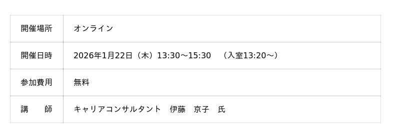 ミドルシニア世代(概ね35歳から59歳)向け就職支援オンラインセミナー(奈良労働局委託事業 令和7年度中高年世代活躍応援プロジェクト)2026/1/22(木)開催