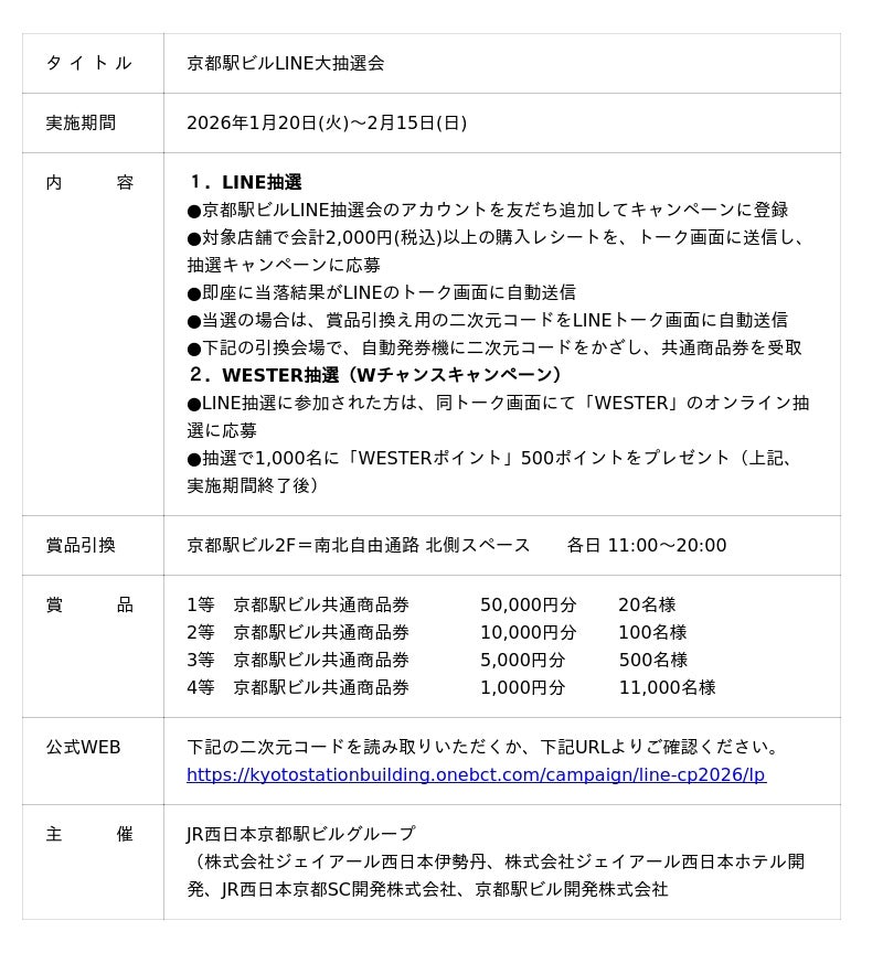 JR西日本京都駅ビルグループ(株式会社ジェイアール西日本伊勢丹、株式会社ジェイアール西日本ホテル開発、JR西日本京都SC開発株式会社、京都駅ビル開発株式会社)は、ジェイアール京都伊勢丹・ホテルグランヴィア京都・京都ポルタ等の店舗を対象に、京都駅ビル共通商品券が当たる「京都駅ビルLINE大抽選会」を開催します。