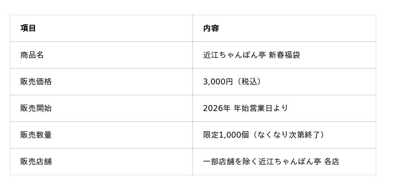 「近江ちゃんぽんをニッポンのちゃんぽんに!」を掲げるドリームフーズ株式会社(本社:滋賀県彦根市/代表取締役社長:山本英柱)は、当社が運営する「近江ちゃんぽん亭」にて、2026年の年始営業より、数量限定の『新春福袋』を販売いたします。