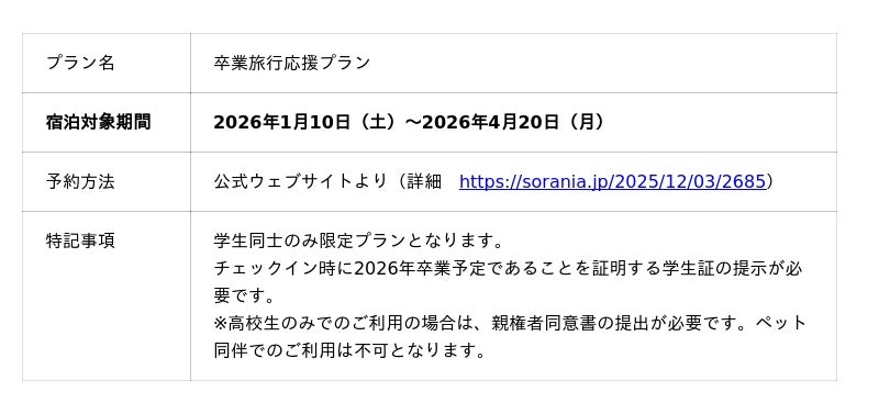 本プランは、2026年卒業予定の学生グループ(大学生・専門学校生・高校生)のみが利用可能です。チェックイン時には、学生証および年齢確認のご提示が必要となります。(高校生のみでのご利用の場合は親権者同意書の提出が必須です)。